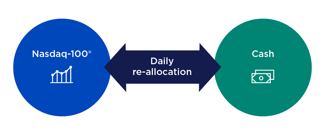 The underlying index aims to provide more consistent and stable returns by maintaining a 10% volatility target. To accomplish this, the Index monitors intraday trading data and shifts exposures more heavily to cash1 during periods of heightened volatility above the target.2